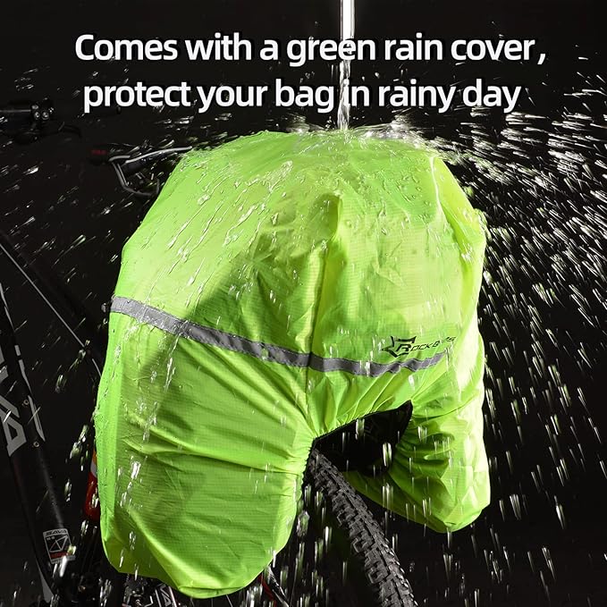- Compatible with Taillights & Water Bottle Holder: A spot in the rear bike rack bag to attach an tail light and high visibility stripes on the side, increase safety at night. Outside water bottle pocket with a cord to tighten which is helpful over rough roads. Come with a bright and reflective rain cover to throw over the whole bike bag.