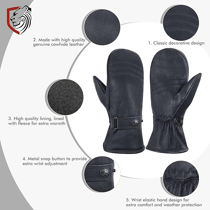 - ✅ [Leather Cold Weather Gloves]: Our men's winter leather gloves and leather mittens for men are made of high-quality genuine leather. Our men's gloves are easy to wear, durable, abrasion-resistant and windproof making it a perfect addition to your cold weather gear. From black football gloves to waterproof winter gloves, we've got you covered in all conditions.