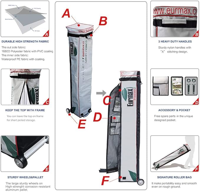 - The canopy tent roller bag: Eurmax unique L shaped roller bag is oversize designed, it is easy to put frame and top in the bag. Big wheels, strong polyester, 2 layers fabric sewed, reinforced handles, all these makes the bag long lasting.