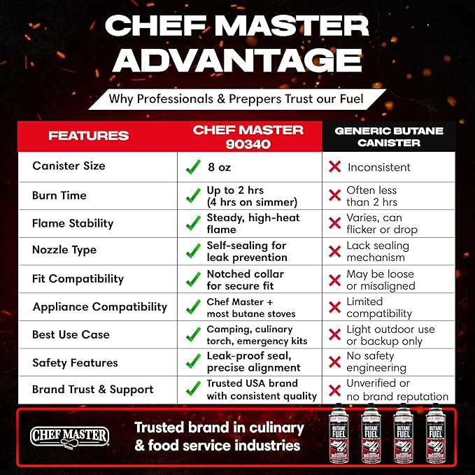 - PREMIUM QUALITY CAMPING STOVE FUEL - Trust Chef Master Premium Performance Butane Fuel for consistent, high-efficiency heat during every outdoor or kitchen cooking task. Specially designed for portable gas stoves, butane torches, and culinary tools, this top-tier fuel is perfect for camping, backpacking, grilling, boiling, and preparing crème brûlée. Each 8 oz. canister delivers clean, reliable performance, making it ideal for food trucks, tailgating, catering events, and emergency kits.