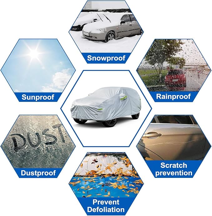 - ❰Extreme Weather Protection❱ ⎯⎯ KouKou oxford weatherproof car cover provide overall protection for your vehicle from all-weather elements: sun, dust, snow, industrial pollution, bird droppings, leaves, pollens, acid rain and etc.