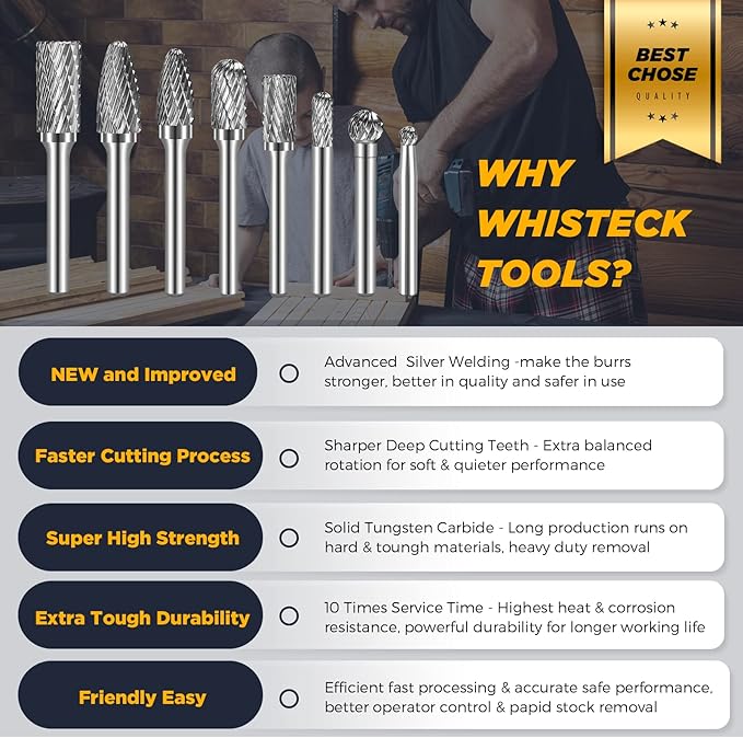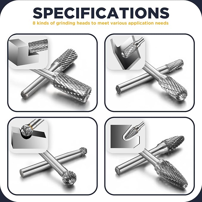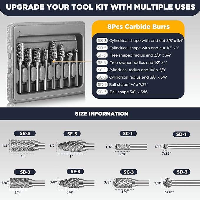 - 【PREMIUM MATERIAL】: 8pcs carbide rotary burr set, made of heat-treated tungsten carbide steel, good toughness and resistance, sharp and sturdy. Unique tooth angle prevents chipping for the longest lasting design possible