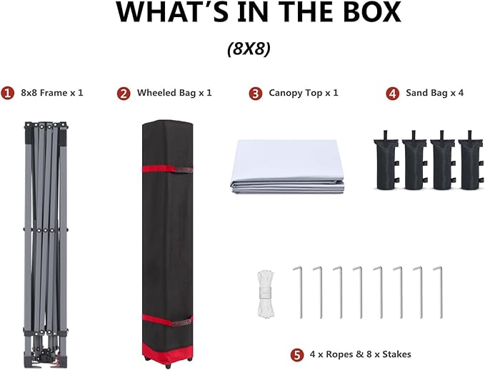 - 【MULTIPLE CHOICE】:ABCCANOPY pop up canopy available in 6.6x6.6ft, 8x8ft, 10x10ft or 12x12ft, multiple colors making them great for couples, families,or small gatherings in the backyard with friends. 【TIPS:please do not leave this canopy outside in wild weather, especially stormy weather, remove the top from frame and stored in the storage bag after dry】Check above to find the perfect fit for you!