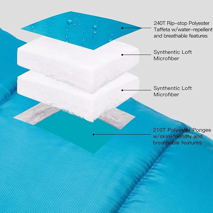 - Water Resistant & Comfort: Lining adopt 240T Rip-stop Polyester Taffeta water-repellent and breathable features, it effectively increases the toughness of the sleeping bag. and with double layer synthetic loft microfiber,provides greater comfort for your body.