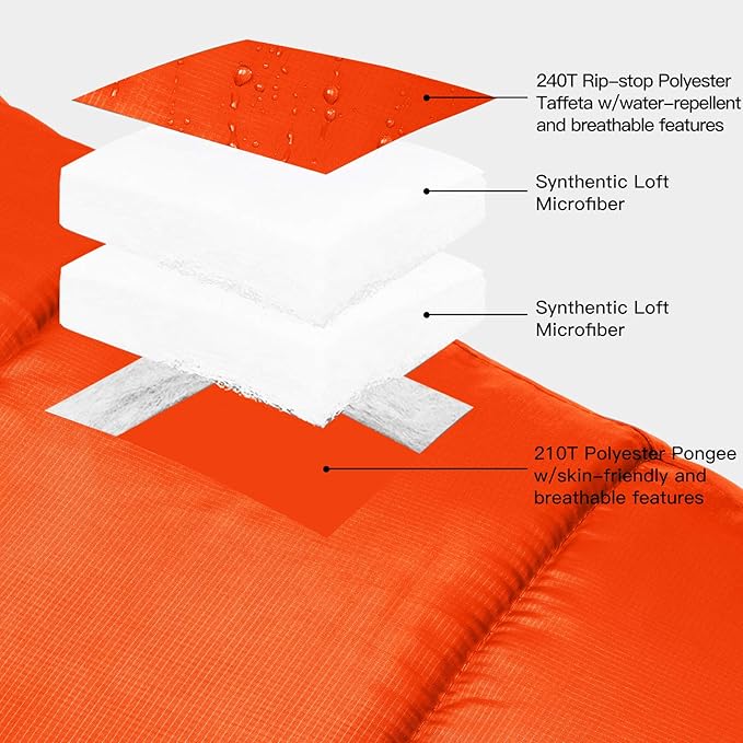 - Water Resistant & Comfortable: Lining adopt 240T Rip-stop Polyester Taffeta water repellent and breathable features, It effectively increases the toughness of the sleeping bag. and with double layer synthetic loft microfiber, Provides greater comfort for your body