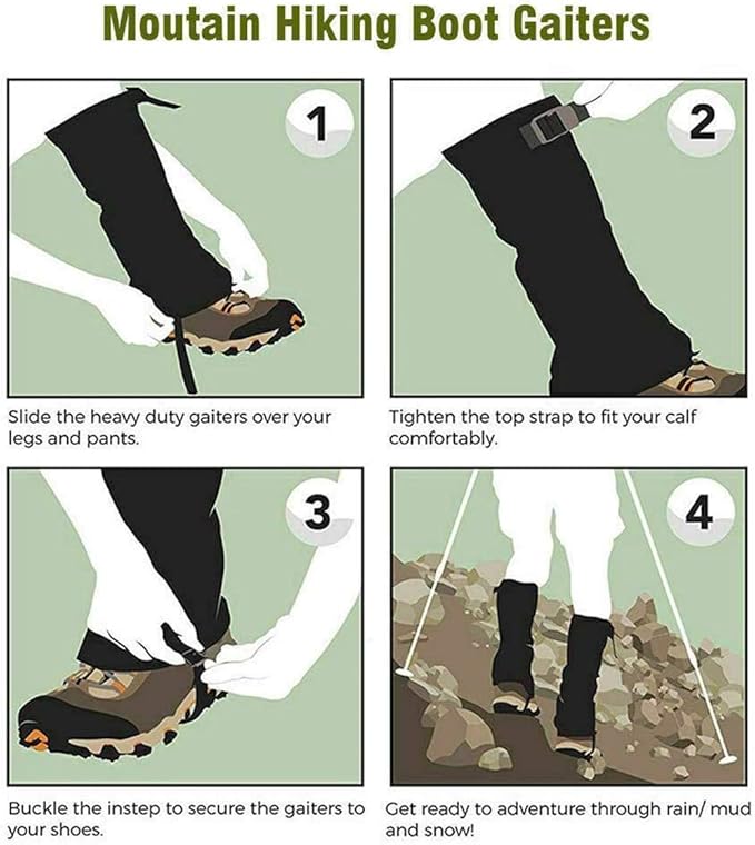 - All-Weather Waterproof Performance: With a high-quality waterproof coating, our snake gaiters keep legs dry—doubling as snow gaiters for men in cold. They block mud/wind/sand/insects. A stainless steel wire strap boosts durability and prevents freezing, making them a year-round must-have.