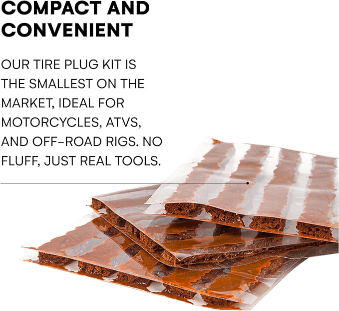 - Compact and Convenient: Compact tire repair kit with a durable molle storage pouch; easily fits into your motorcycle tool kit, ATV tire plug kit, or overlanding gear; ideal for on-the-go repairs