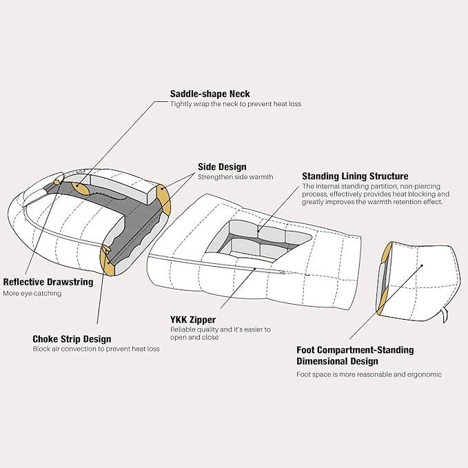 - EXTRA SPACE FOOT AREA- This down sleeping bag can provides you extra space to keep your feet stretched.