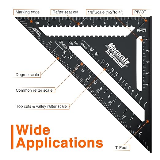 - 【User-friendly and Ergonomic Design】: Mecurate rafter square is thoughtfully engineered with convenience and comfort in mind. Its humanized design allows for easy hanging and storage when not in use, ensuring it's readily accessible whenever you need it. This practical feature helps keep your workspace organized and efficient.
