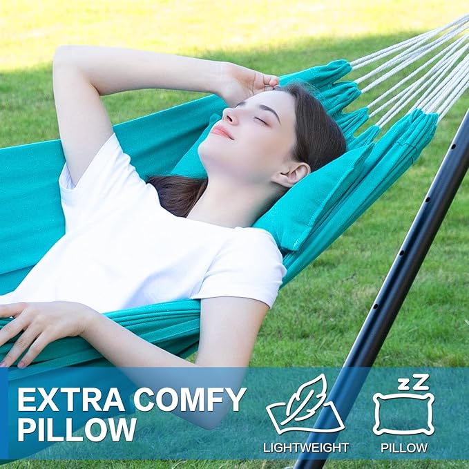 PNAEUT Double Hammocks with Stand for Outside, Portable Space Saving Heavy-Duty Steel Stand for Indoor Outdoor Patio with Carrying Bag, 450 lbs Capacity (Aqua)