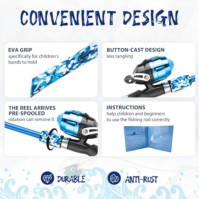 - Suitable Present for Kids - Suitable and lightweight for age 3+, designed to be simple and easy to use for them to use, the spin-cast reel is safer for them as well. A great present for Birthday, Children's Day, etc. PLEASE follow the user instruction to use. If you got any problems when using this item, please tell us for satisfactory solutions. Tips: Tighten the fishing line when retrieving the fishing rod to avoid entanglement of the fishing line