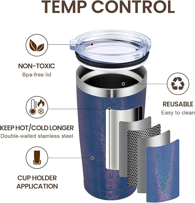 - DURABILITY- 18/8 food grade stainless steel body, No BPA, healthier than plastic cup. The insulated tumbler never sweat due to the Vacuum insulated design. Powder coating on the outside fits more comfortably in your hand, looks good, anti-slip