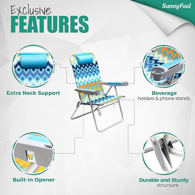 - A High Beach Chair that is Built for Anywhere: Use it as a camping chair, folding chair, lawn chair, travel chair, beach chair and more. Suitable for outdoor adventures, tailgating, fishing, backpacking, beach, picnic, sport games, car travelling, or just put it in the backyard, cabin, balcony, patio lawn parties. The SunnyFeel camping chair is an essential to add to your camping accessories.