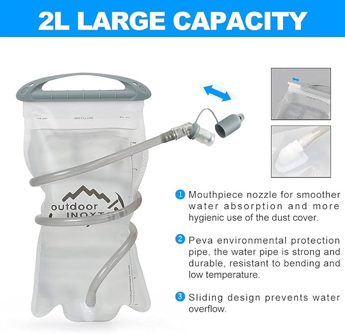 - 【2L Hydration Bladder 】◕‿ ◕:The 2 liter hydration water bladder can fill water and ice super quickly, it is more convenient to clean no matter when the water temperature is range -20~+50℃.the water tube (40"length,0.4"diameter) provides a healthy flow for easy drinking.