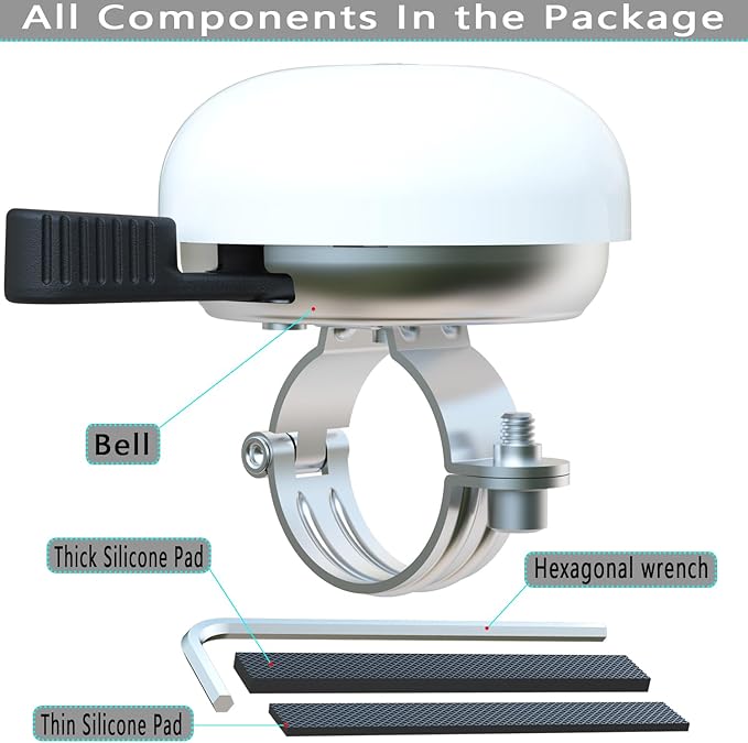 - Easy Installation:Our bicycle bell is suitable for bicycle handlebars with sizes ranging from 22.2-25.4-28.6 mm. We provide two types of rubber pads, thick and thin, to prevent slipping and scratching. The installation is very simple and only requires a hex wrench