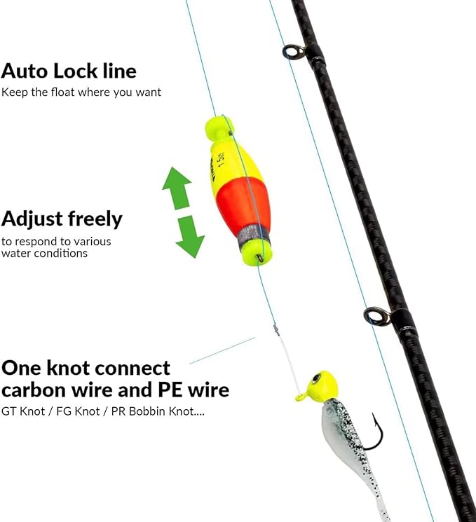- SPRING FIXED DESIGN:Spring fixed design allows for quick and easy depth setting.Snap on float that keeps the hook and bait suspended above the bottom at the desired depth.Slip bobbers are certainly more cosmetically pretty and don't pinch your line.