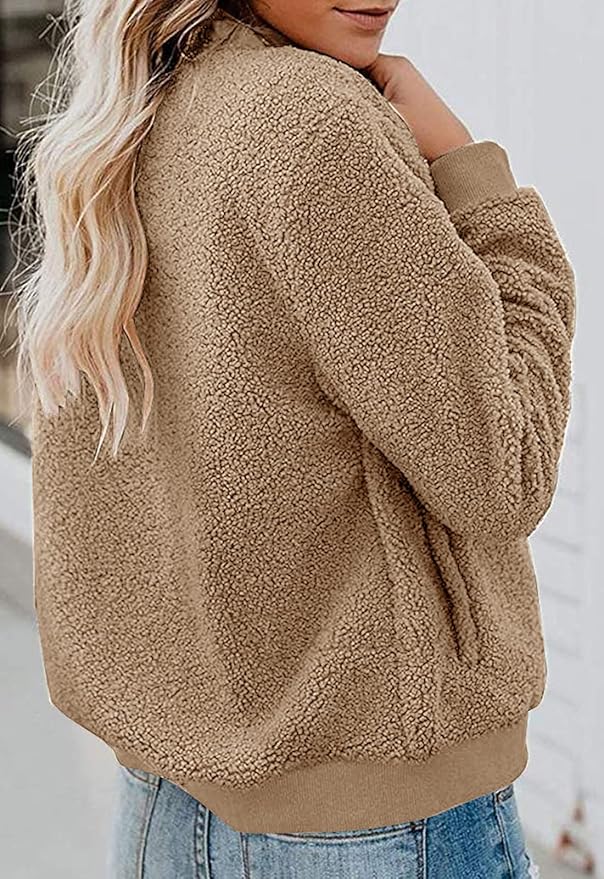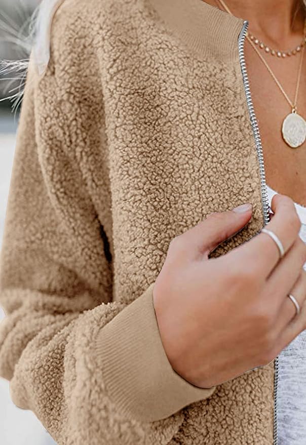 - DESIGN: The fuzzy fall jacket features soft and warm fleece, long sleeves, zipper closure, ribbed hem cuffs, lightweight lining and two pockets, casual relaxed loose fit, is a stylish and classic bomber jacket.