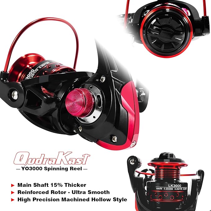 - QudraKast YO-3000 Fihisng Reel: 12+1 Full Metal Body and Sideplate with High Carbon Fiber Machined Aluminum Reel Seat, Hydrophobic Line Roller Bearing, Over 100,000 Tests High-Intensity Anti-Corrosion, Split Design Grip for maximized lightness and comfort, Gear ratio: 5.2:1.