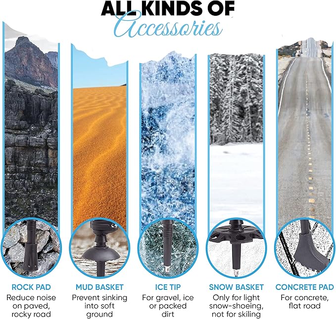 - ✅ All-Terrain Performance: Includes 10 rubber tips for various surfaces—gravel, mud, sand, snow, or pavement. Ideal for trekking, walking, hiking, or mountaineering in all weather.