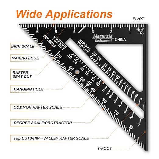 - 【Multi-function】: Suitable for the measurement, Mecurate rafter square can be used as a protractor, woodworking compass, triangle square and frame square. The horizontal base is convenient for marking, smooth and practical.