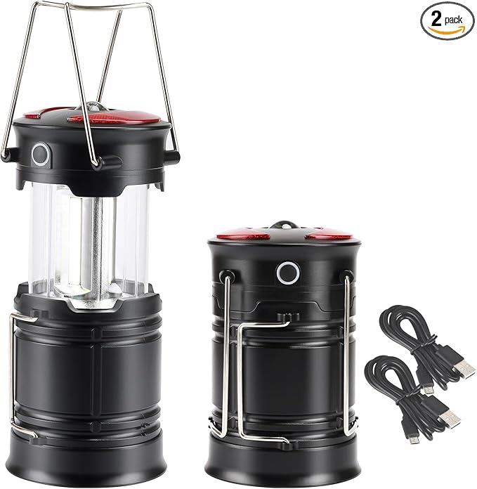 - SET INCLUDES: 2 Pack 2 IN 1 Collapsible COB LED Lanterns and Flashlight with Red Warning Light, with extra storage compartment at the top of the lantern for store keys, change, or spare batteries, set essential for camping and survival