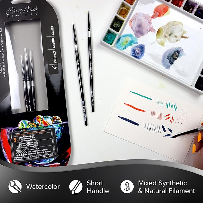 Silver Brush Limited WC-3204s Black Velvet Watercolor Round Set, Set of 3, Sizes 0, 2, and 4 Round Paintbrushes, Short Handle