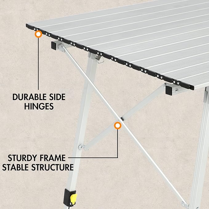 - Easy to Install and Carry: No tools are required, and can be assembled within 1 minute. The aluminum slatted table top can be rolled up. Folded and put into the carry bag, very compact and space-saving. Easy to store and transport, great for storing in your car or RV, perfect for camping tailgating or backyard use