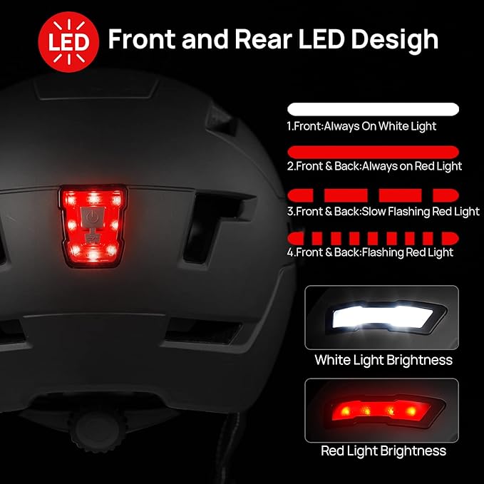 - Highly Visible: This bike helmet designed with USB rechargeable front and rear light. While the front lights provide lighting, the rear lights provide higher visibility for the vehicles or people behind you, providing better protection on the city streets; Features 4 lighting modes, the bike helmet light can be easily changed lighting modes from Steady into Flashing or Blinking by simple clicks button.