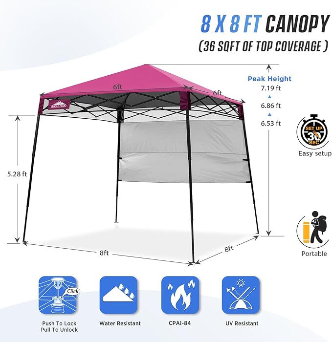 EAGLE PEAK 8x8 Pop Up Canopy Tent with Sidewall, Compact, Portable Slant Leg Instant Sun Shelter for Beach, Sports, & Camping, 8x8 Base 6x6 Top, Pink