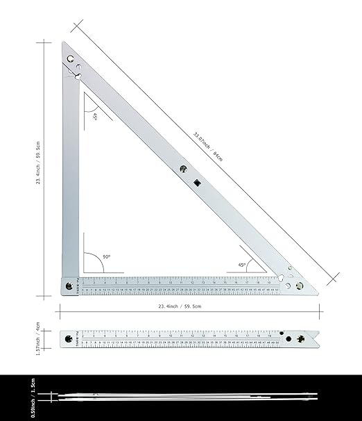 - 【Precision Angles & Dual Measurement Scales】Adjustable 45°-90° right-angle ruler for quick marking and cutting of accurate angles. Features clear imperial (inches) and metric (cm) scales on both sides for versatile measurements, ideal for framing, roofing, stair building, and pattern making.