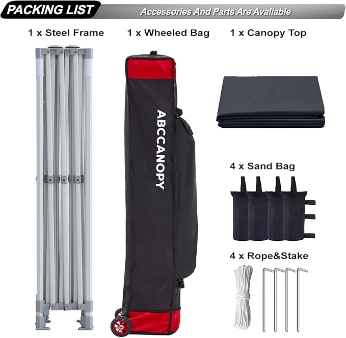 - [Highlight and Technology] (1)Special designed peak tensioner design, lift the top higher to ensure the top tight and firm. Will not collected water in rainy days. Beautiful and Safety.(2)ABCCANOPY oversize designed roller bag allow you to easily put frame and top inside. The flexible big wheels, conveniently and smoothly. Satisfy your need and long lasting.