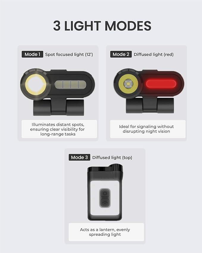 - 3 LIGHT MODES & 230LM BRIGHTNESS: Choose from Focused, Flood (Cool White), or Red Diffused light modes, with a powerful beam distance of 3 - 50 meters. Ideal for camping, hiking, and emergencies, plus SOS Strobe mode for signaling.