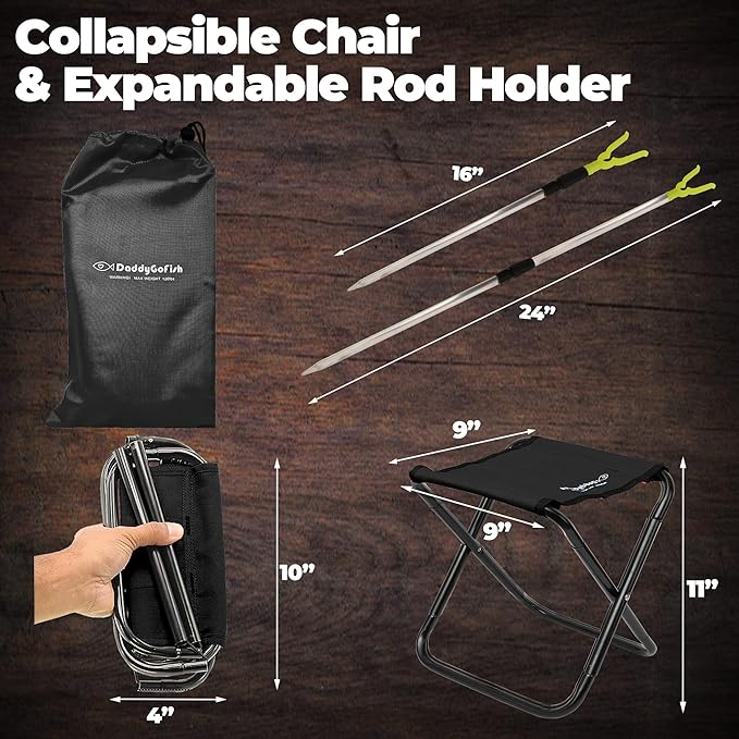 - COLLAPSIBLE CHAIR AND ROD HOLDER - Kids have a place to rest wherever they go. The rod holder keeps the fishing pole off the ground and minimizes the chance of accidental damage.