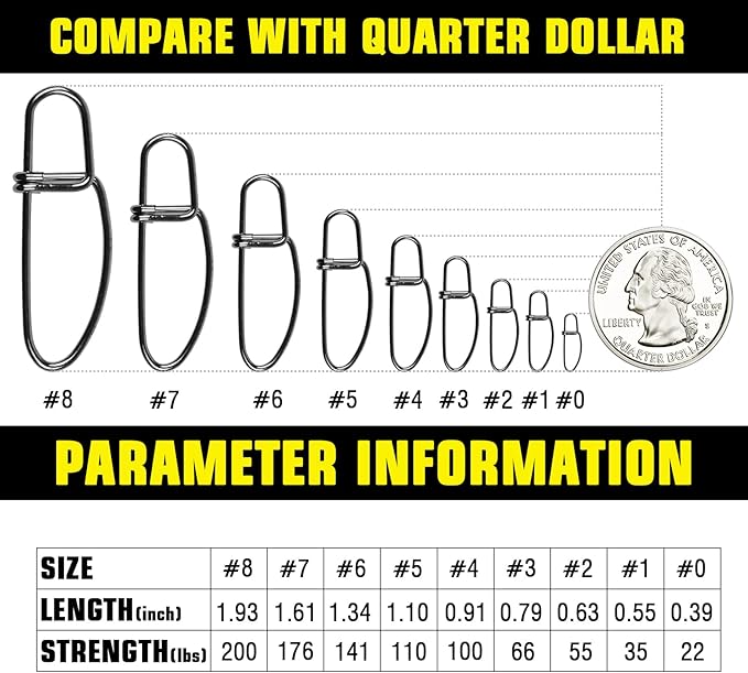 - High Quality Multi Usages:The high strength snap clip could be used for various usages. It could be suitable for not only freshwater on rivers and lakes but also for sea fishing. The strength of fishing swivels are different from 22lb to 200lb. Please confirm your suitable sizes of snap swivels before purchasing it.