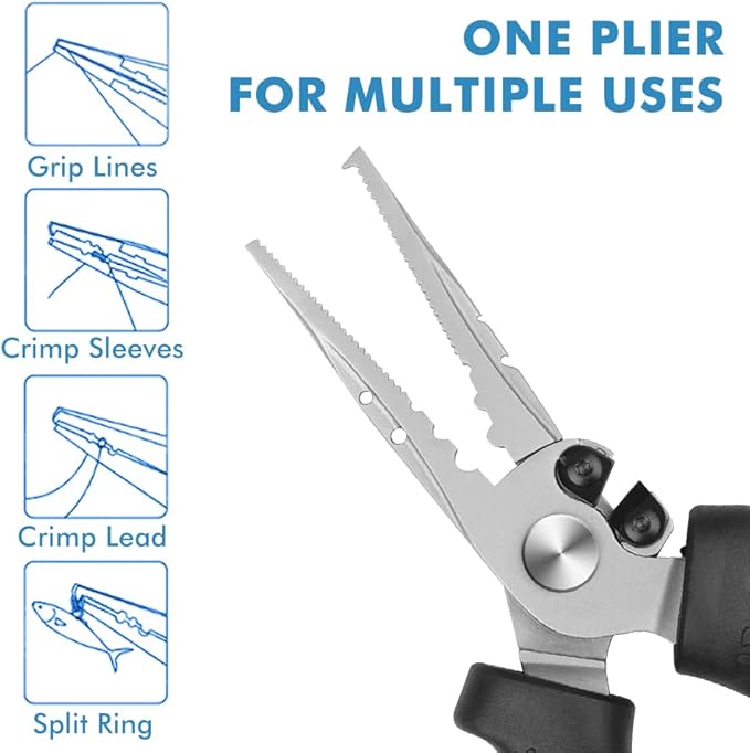 - MULTI-FUNCTION JAWS – Pliers steel jaws include crimping slots to secure a split shot weight or build a leader.Built-in tuning slots allow you to quickly adjust your baits for the perfect swimming action. When used as a fish hook remover, its fine serrated jaws allow you to firmly grip hooks of varying wire diameters for easy and safe removal. Grooved slots near the back of the jaws are ideal for crimping sleeves for a leader or attaching split shot weights to your line.