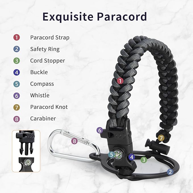 - Full-function Paracord Handle: Brilliant paracord of matching colors bring out the bottle with a touch of youthful vibe. Compact compass and handy carabiner make the bottle the ideal survival kit for expeditions in the wild