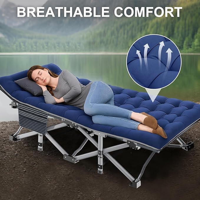 - Premium Fabric: This camp bed is constructed in a Double Layer of 1200 D oxford for Superior Strength,Easy- Cleaning. For cleaning, you can wipe the top fabric and the poles with a wet cloth. The crossbar of the cot is lower than the fabric of it. You will sleep well and won’t feel the bar