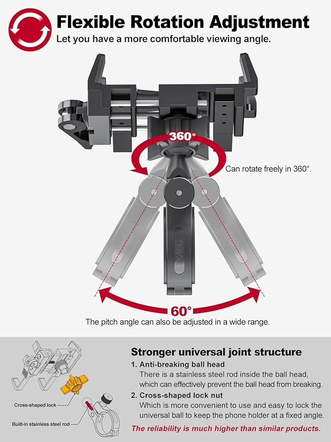 - 【Lock in 1 second, no tools required】 Exquisite structure, easy to use. No tools required, with a quick release button on the right side, it only takes 1 second to install or remove the phone. Compared with the traditional motorcycle phone holder, this aluminum cell phone holder saves 90% of the time. The metal swivel mechanism is firm and reliable, with spherical shape universal joint, which can rotate 360°, you can freely adjust the viewing angle.