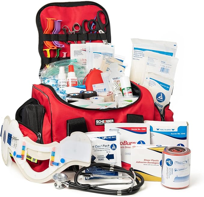 Scherber First Responder Fully-Stocked Large Professional Essentials EMT/EMS Trauma Kit | HSA/FSA Approved | Reflective Bag w/8 Zippered Pockets & Compartments & 250+ First Aid Supplies (Red)