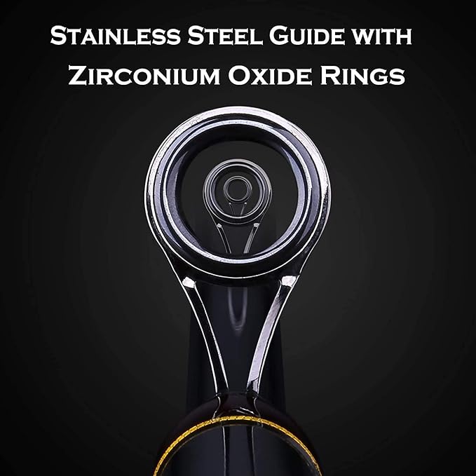 - 🎣 The welded stainless steel guides with Zirconium Oxide rings for superior casting distance and accuracy while dissipating heat more efficiently which delivers excellent durability with monofilament, fluorocarbon and braided lines.