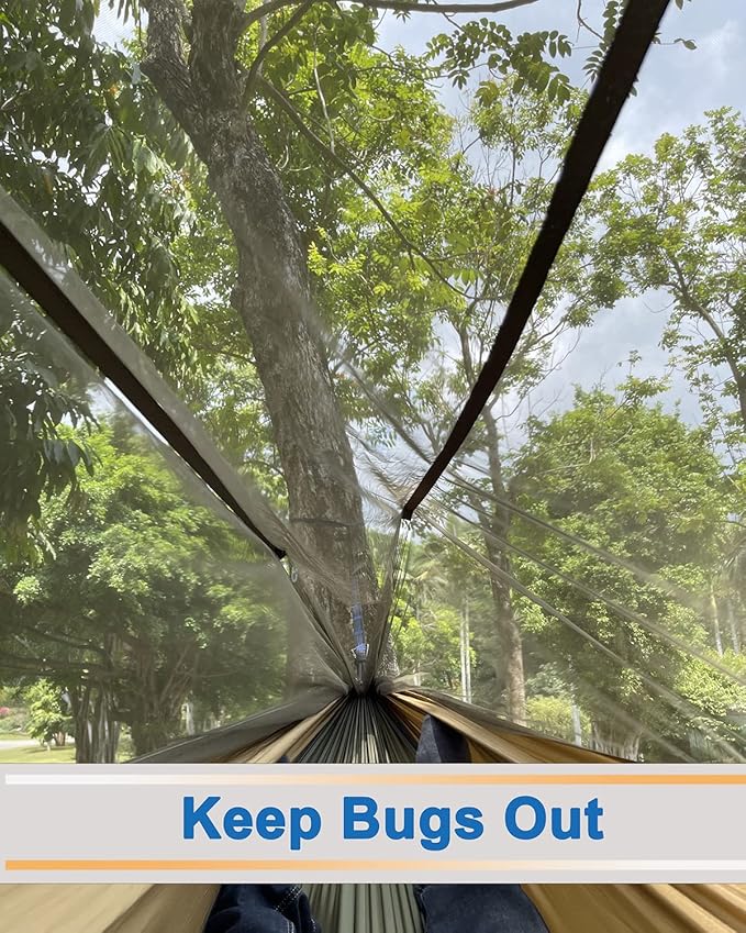 - Upgraded Camping Hammock Installation: Say goodbye to complicated installation method,our camping hammock has 2 adjustable ropes with hook,just carry the rope then connect the hook with tree straps.Upgraded net is more dense and durable which can effectively stop the bites and harassment of insects.Extra large space can give you maximally comfortable,have a snuggle, stretch out or even have your pets with you in our hammocks