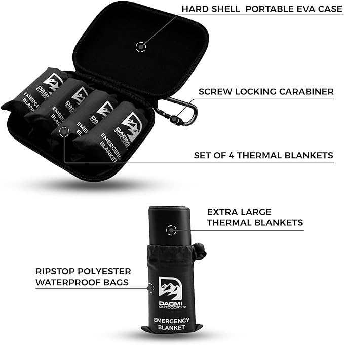 - What You Will Get - 1 premium quality emergency blankets 4 pack which includes 4 mylar blankets, 1 hard shell EVA case, & 1 screw lock carabiner. Be prepared for emergencies with our freeze blankets!