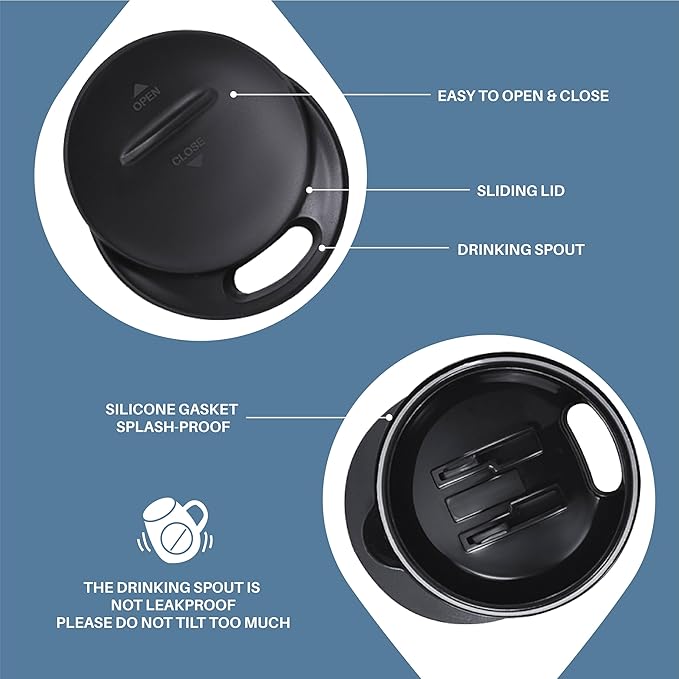 - 【PRESS-IN LID】- Silica gasket seals to achieve maximum spillproof capability. Drinking hole on the top, with a splash-proof sliding cover. Please note it is to keep drinks contained and prevent heat/cold from escaping. It is not leakproof.
