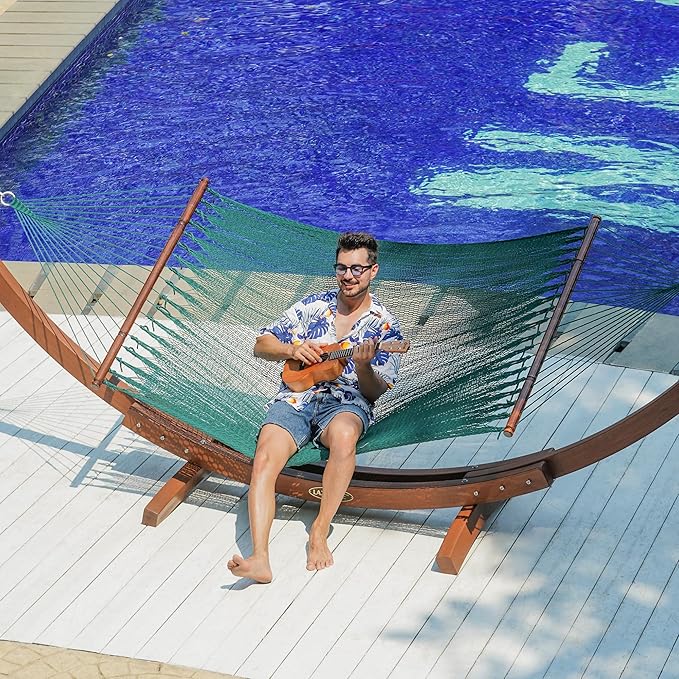- EXTRA LARGE HAMMOCK: With a spacious bed measuring 75 x 51 inches and supported by elegant 51-inch hardwood spreader bars made from FSC-certified wood, this hammock offers plenty of room to stretch out. Double hammock has a weight capacity of 450 pounds, comfortably accommodating two people. It's time to own a Lazy Daze Caribbean Hammock