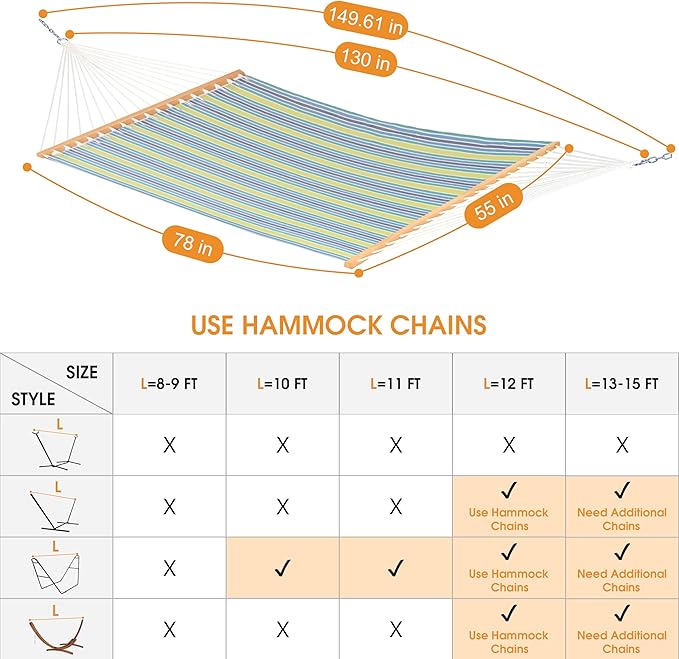 - HANGING SOULTION: This 11ft hammock is compatible with 12ft-15ft hammock stand. Check the length of your hammock stand before you make a purchase. Hammock can also hung between trees, with a height of 60-66 inches and a tree spacing of 144-240 inches. It’s perfect for patio, backyard, poolside, balcony or beach