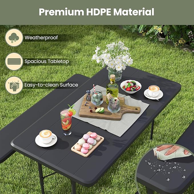Tangkula Folding Picnic Table with 2 Benches, Outdoor Metal Camping Table Set with Plastic Wood-Like Texture Tabletop & Steel Frame, Foldable Camping Table for Picnic, Party, BBQ (Black)
