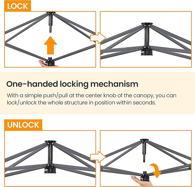 - Adjust Canopy Height At Will: With no preset heights, you can freely adjust the instant canopy tent height from 8.5′ to 9.5′ along the telescopic legs. The quick-lock clamp adjusters help you lock the legs in place with ease