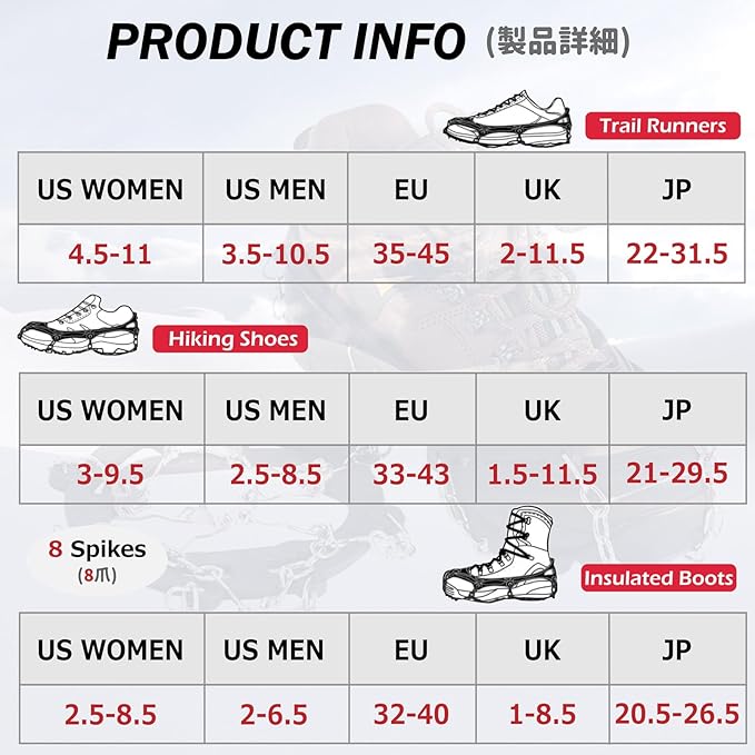 - ✅ MULTIPLE USES: Used on angled terrain, snow and ice roads, icy driveway, muddy and wet jungle, damp grass lawn, dangerous sections of trail, etc. Great for trail running, hiking, jogging, walking, ice fishing, mountaineering