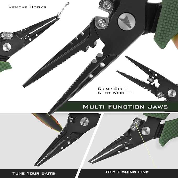 - Multi-Function Jaws – Grab and remove any fishhook with the serrated jaws or take advantage of the crimping slots to secure a split shot weight or build a steel leader. To cinch down a knot quickly and safely, insert your hook into one of the holes in the jaws and pull on your hook to create a tight knot. Available in both a straight nose and a split ring nose design.