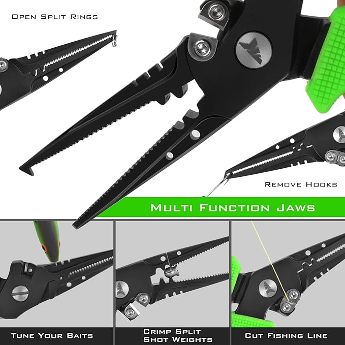 - Multi-Function Jaws – Grab and remove any fishhook with the serrated jaws or take advantage of the crimping slots to secure a split shot weight or build a steel leader. To cinch down a knot quickly and safely, insert your hook into one of the holes in the jaws and pull on your hook to create a tight knot. Available in both a straight nose and a split ring nose design.